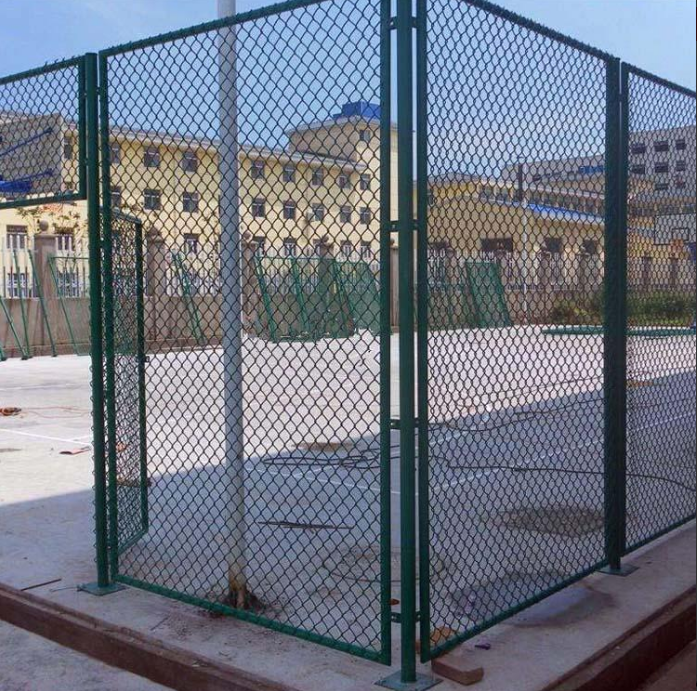 采用(yòng)φ3.8鍍鋅線(xiàn)包塑網(wǎng),網孔規格45MM×45MM,網高4 M,立柱用φ75鋼管,橫柱用φ60鋼管刷二遍防(fáng)鏽(xiù)專用底漆(qī),二遍墨綠色麵漆,包塑網用包塑扁鐵壓緊,用鍍(dù)鉻螺絲固定於網架上.做一扇1200×2000MM單門. 在基礎施(shī)工時,按照預埋件施工示意圖所標(biāo)明的尺(chǐ)寸,須先預埋好預埋件。挖500*500的地槽,燈柱預埋件的尺寸為300*300mm,圍網(wǎng)預埋件的尺(chǐ)寸為 250*250mm。每(měi)個預埋件(jiàn)用4個12mm的鋼筋焊接(jiē)固定,鋼筋(jīn)的長度為400mm。鋼筋在端部(bù)彎起。 圍網由包塑(sù)網、立柱、橫杆以及連(lián)接構件組成。網(wǎng)高4米,所以在圍網中間(jiān)設立一跟橫杆,用φ75鋼管,主要增強(qiáng)圍網的受力。圍網(wǎng)立杆的間距由球(qiú)場四周範圍(wéi)的尺寸決定,一般間距不超過3.8米。也不能太小,否則增加成(chéng)本。
